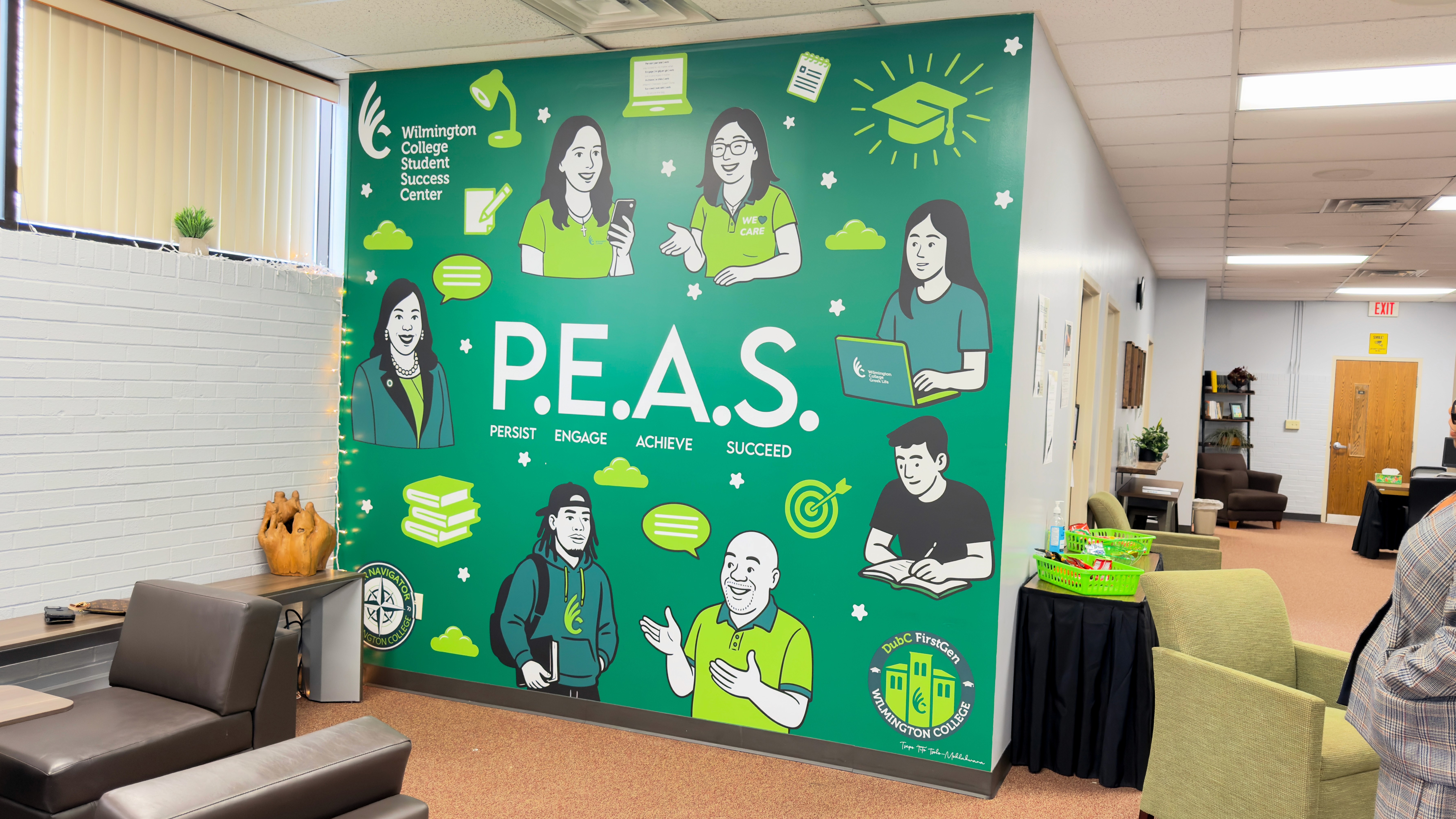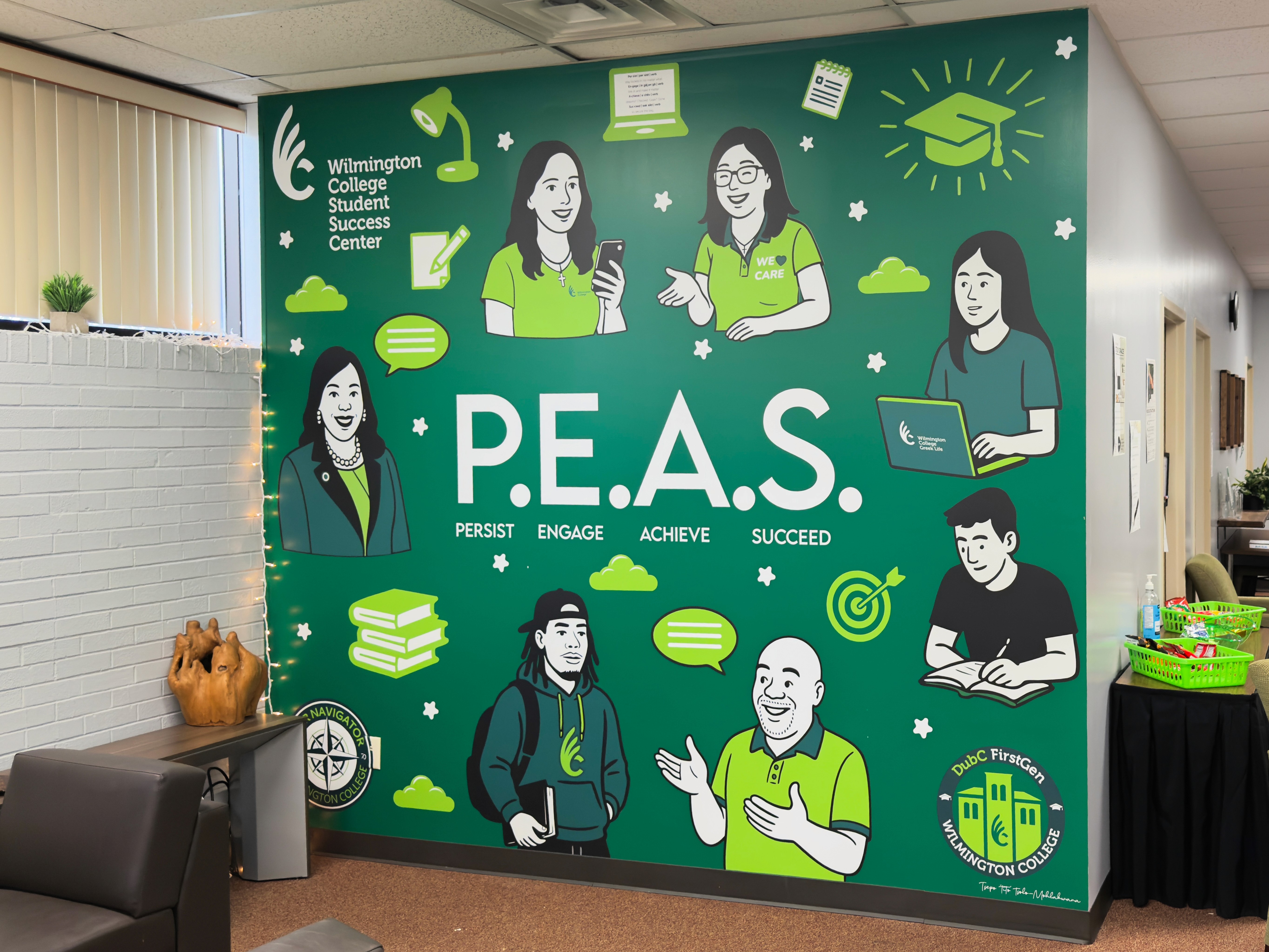 During my graphic design internship at Wilmington College, I helped build visual identity work for the Student Success Center, including a large-scale PEAS values mural, branded materials, and campus-facing design assets across print and digital formats.